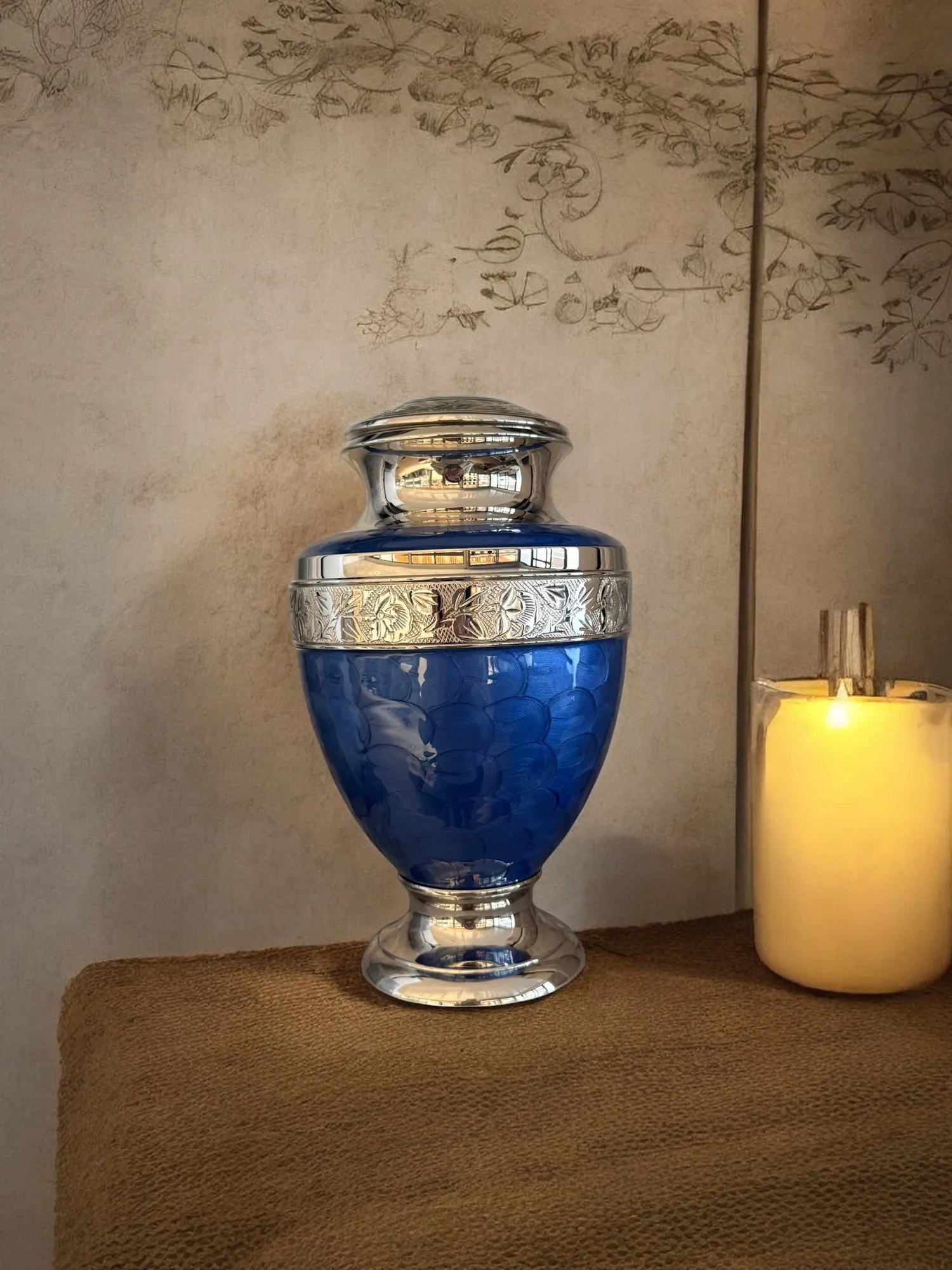 Ánfora con profundo tono azul que simboliza paz y eternidad, con delicados relieves y grabados en plata que aportan brillo y distinción. Su diseño noble y solemne la convierte en una pieza creada para custodiar con respeto y honor las cenizas de un ser amado, manteniendo viva su memoria.