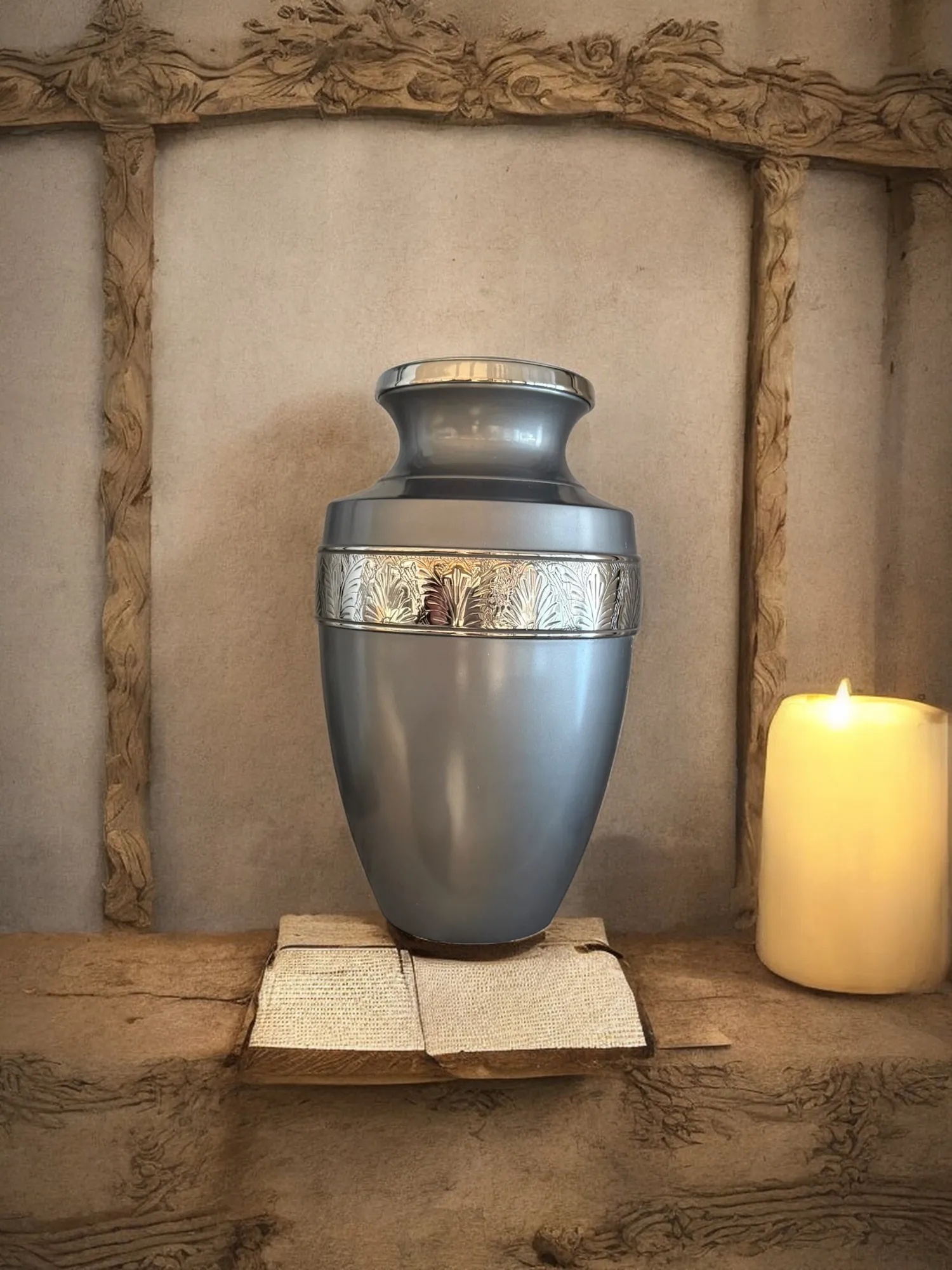 Ánfora con acabado gris metalizado y delicado grabado en plata que simboliza armonía y fortaleza. Su diseño sobrio y atemporal transmite calma y respeto, ofreciendo una pieza distinguida para custodiar con honor y serenidad las cenizas de un ser querido.