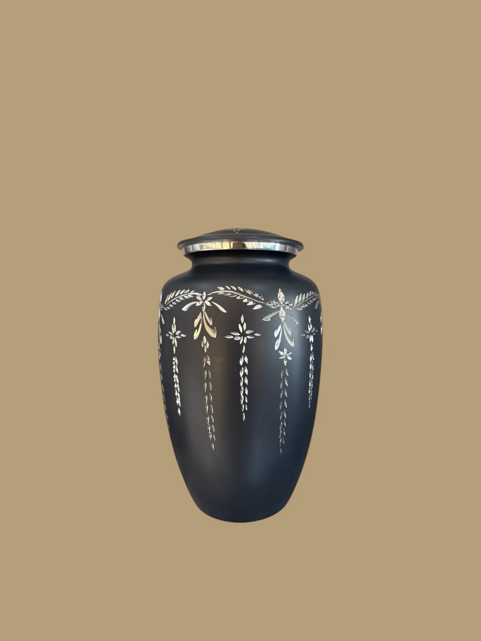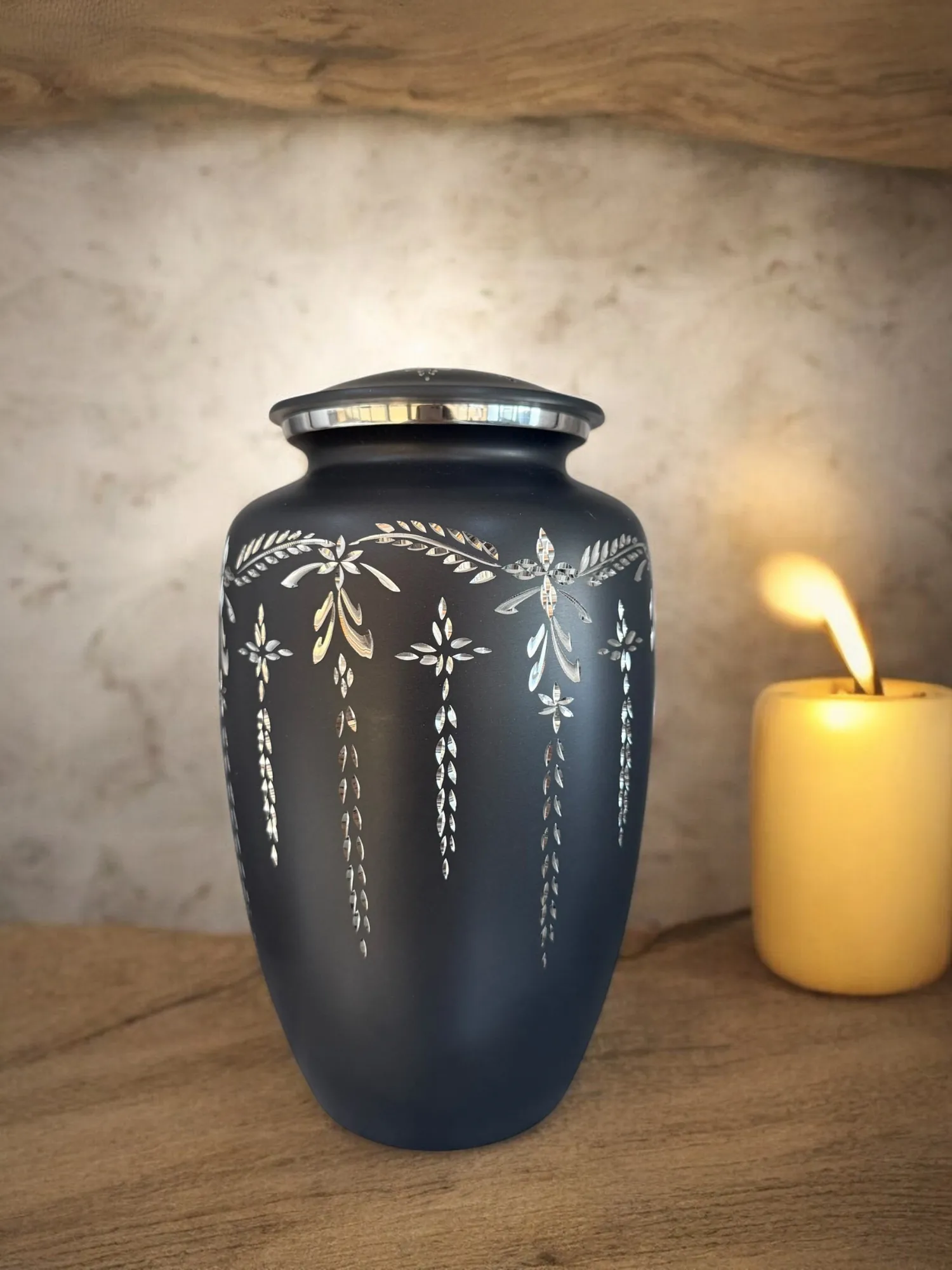 Con detalles que evocan flores suspendidas en el tiempo, esta ánfora guarda la memoria con calidez y respeto profundo.