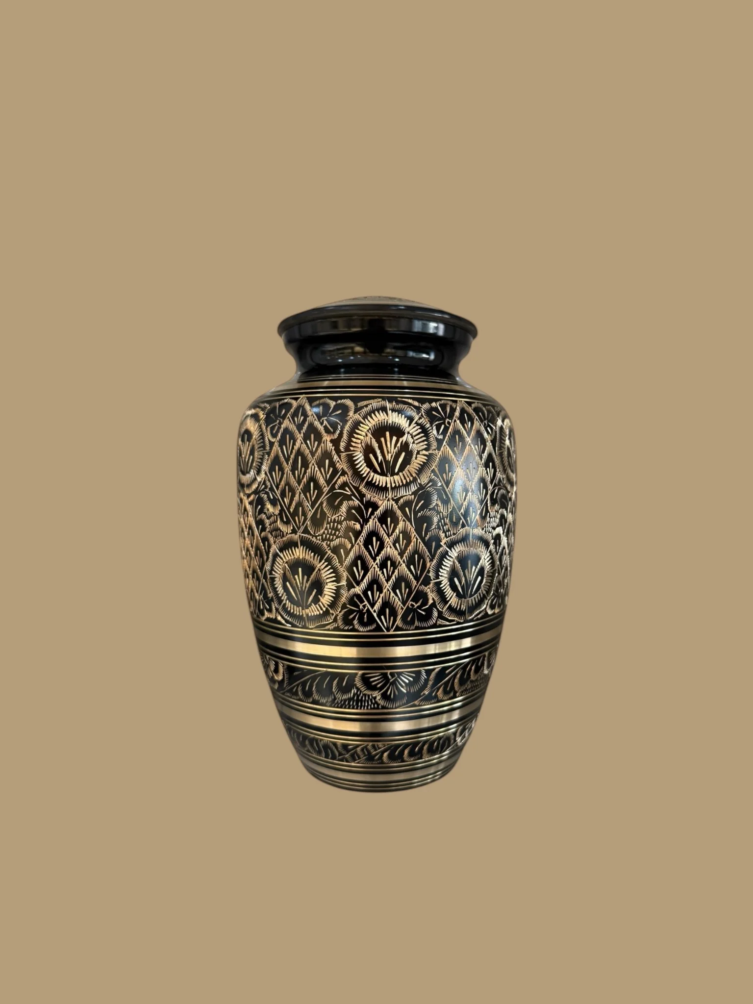 De acabado negro con intrincados grabados plateados, esta ánfora refleja nobleza y distinción. Cada detalle tallado simboliza el valor del recuerdo y la grandeza de una vida que deja huella.